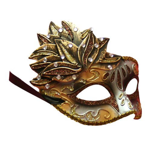 Ultra glamorous and intriguing, this masquerade style mask will make you the Belle of the Ball. Mask features brown and gold glitter throughout with a gold brocade trim. Crystal colored rhinestones finish off the top side piece.Mask securely ties on with black ribbons.