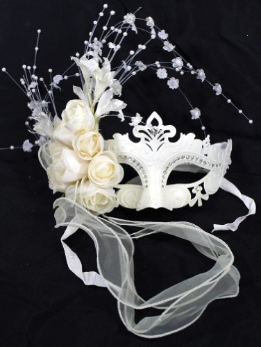 RedSkyTrader - White Venetian Masquerade Ball Mask with Sparkled Designs and Roses - One Size fits Most - White